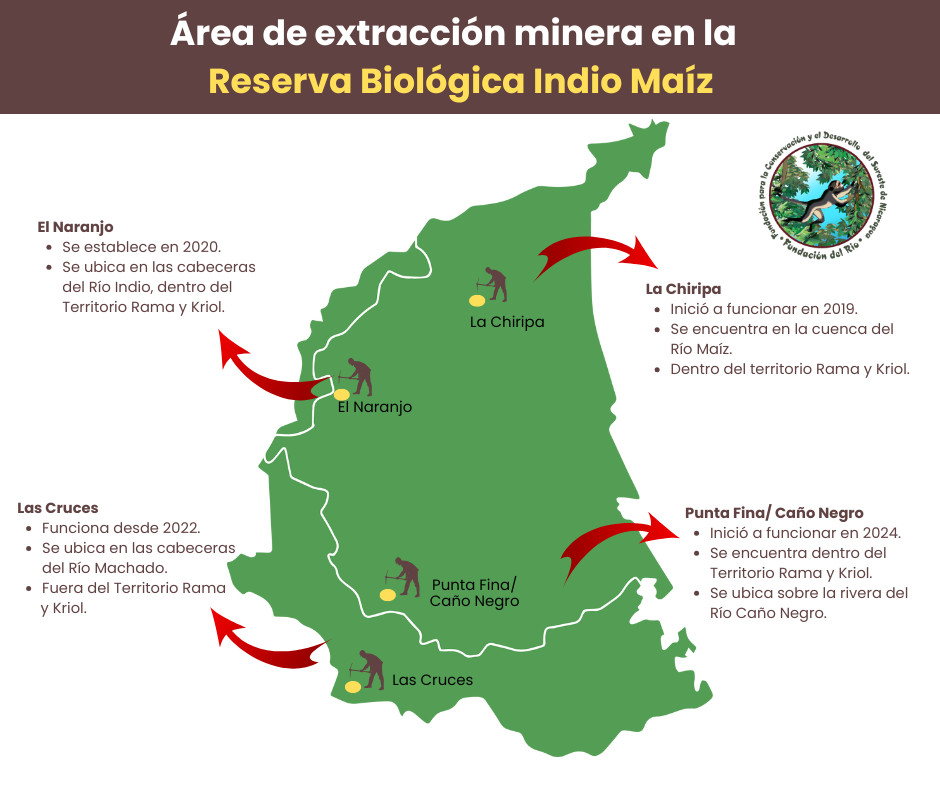 Aumentan las denuncias de actividad minera en sitios de reserva ecológica en Nicaragua. Desde 2019, Fundación del Río ha señalado actividad minería ilegal en la Reserva Indio Maíz y tres dentro del territorio Rama Kriol. Las Cruces es el más grande con 250 hectáreas.