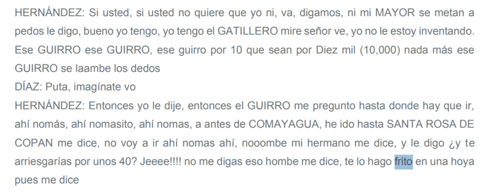 “A partir del análisis de cientos de horas de intervenciones telefónicas obtenidas en el marco de una investigación penal iniciada en 2015, el GIEI constató que Mariano Díaz Chávez, militar en activo y posteriormente condenado como autor material del asesinato, contaba con acceso a armas, logística y personal armado, y utilizaba redes vinculadas a estructuras de seguridad para coordinar operaciones ilícitas. Estas interceptaciones revelaron que, desde el 4 de enero de 2016, se mantenían conversaciones explícitas sobre cinco incursiones previas al asesinato de Berta Cáceres. Estas incursiones involucraron planificación, logística, seguimientos, portación de armamentos y dieron cuenta de la elaboración de un plan concebido con anticipación, a decisiones atribuidas a “los de arriba” y a negociaciones sobre pagos y logística”, revela el informe.