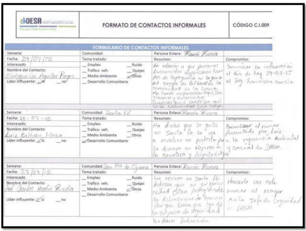 Por ejemplo, DESA contrató personas con conocimientos estratégicos del aparato estatal para facilitar sus operaciones y neutralizar a quienes se oponen al proyecto. El agente J.C.A.N., de la Agencia Técnica de Investigación Criminal (ATIC) es uno de los casos más graves documentados, ya que antes de ser jefe de ATIC trabajó en 2013 como investigador privado para DESA, recolectando información de Berta Cáceres y el COPINH. Este mismo funcionario participó en la escena del crimen el 3 de marzo de 2016 y coordinó investigaciones sensibles del Ministerio Público, sin revelar sus vínculos con la empresa.