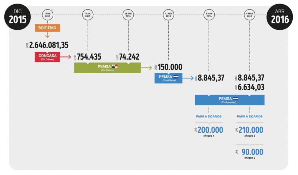 El informe revela que parte de estos fondos fueron desviados para fines ilegales, en lugar de ser invertidos en el proyecto. Alrededor de 12.4 millones fueron manejados de forma irregular o desviados de su fin original: pagar informantes, mantener a militares y policías que custodiaban a la empresa, pago de abogados que defendían a personas que atacaban al COPINH y a otros opositores del proyecto.