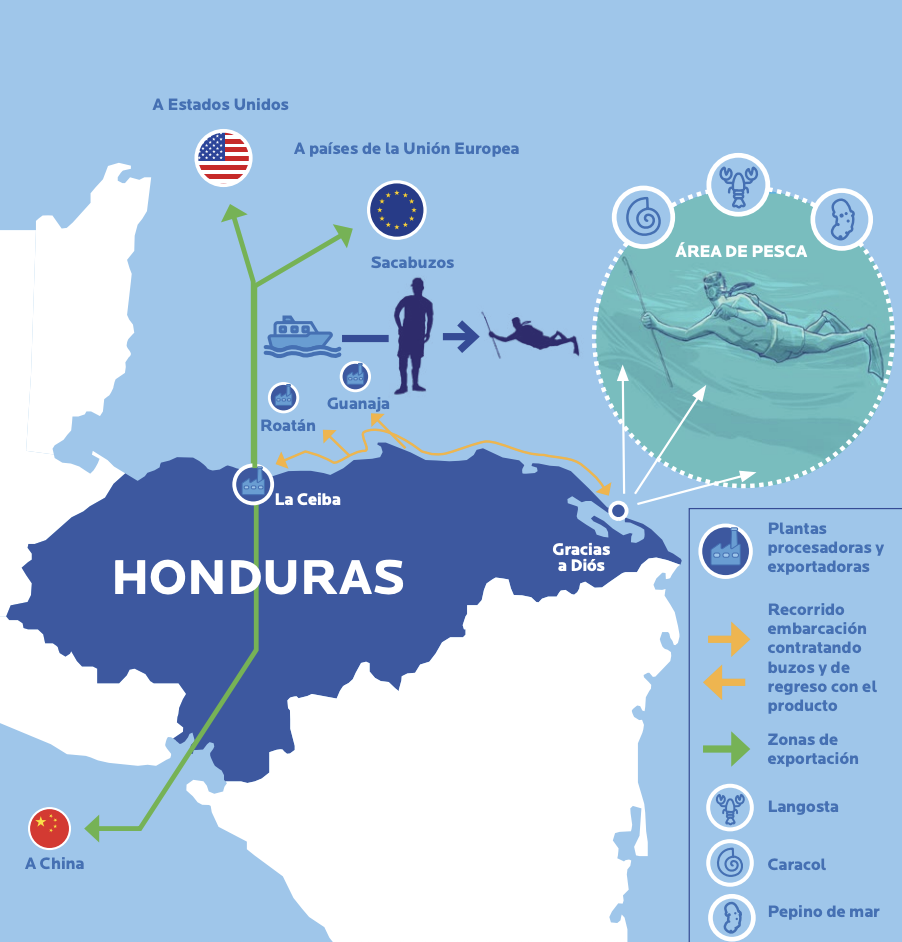 Otro elemento que precariza la vida de la población de La Moskitia es la pesca por buceo de langosta, pepino de mar, medusas y otras especies ambicionadas por empresas Chinas y procesadoras que, según testimonios, pagan$1 por kilo, mientras que son vendidos en restaurantes internacionales por más de $200 dólares.
