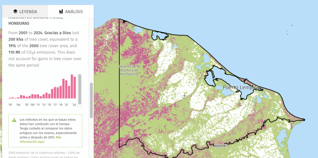 Una de las consecuencias de estas actividades ilegales son los altos niveles de deforestación en las reservas. Según Global Forest Watch, desde 2001 hasta 2024, el departamento de Gracias a Dios perdió 100 kilómetros de hectáreas de bosque primario húmedo, lo que representa 51% de su pérdida total de cobertura arbórea en el mismo periodo de tiempo. El área total de bosque primario húmedo en Gracias a Dios disminuyó en 19% durante este periodo de tiempo.