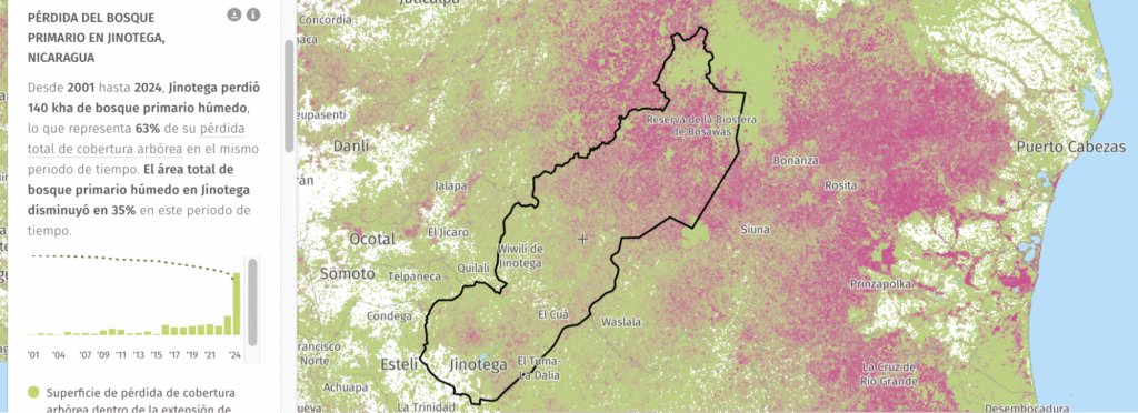 Por otra parte, la Costa Caribe forma parte de todo este gran complejo forestal que incluye la Reserva de Bosawas, una de las más grandes de Centroamérica, la cual vive bajo presión frente al avance agrícola, ganadero, concesiones mineras y colonización. Desde 2001 hasta 2024, el departamento de Jinotega perdió 140 kha de bosque primario húmedo, lo que representa 63% de su pérdida total de cobertura arbórea en el mismo periodo de tiempo. El área total de bosque primario húmedo en Jinotega disminuyó en 35% en este periodo de tiempo.